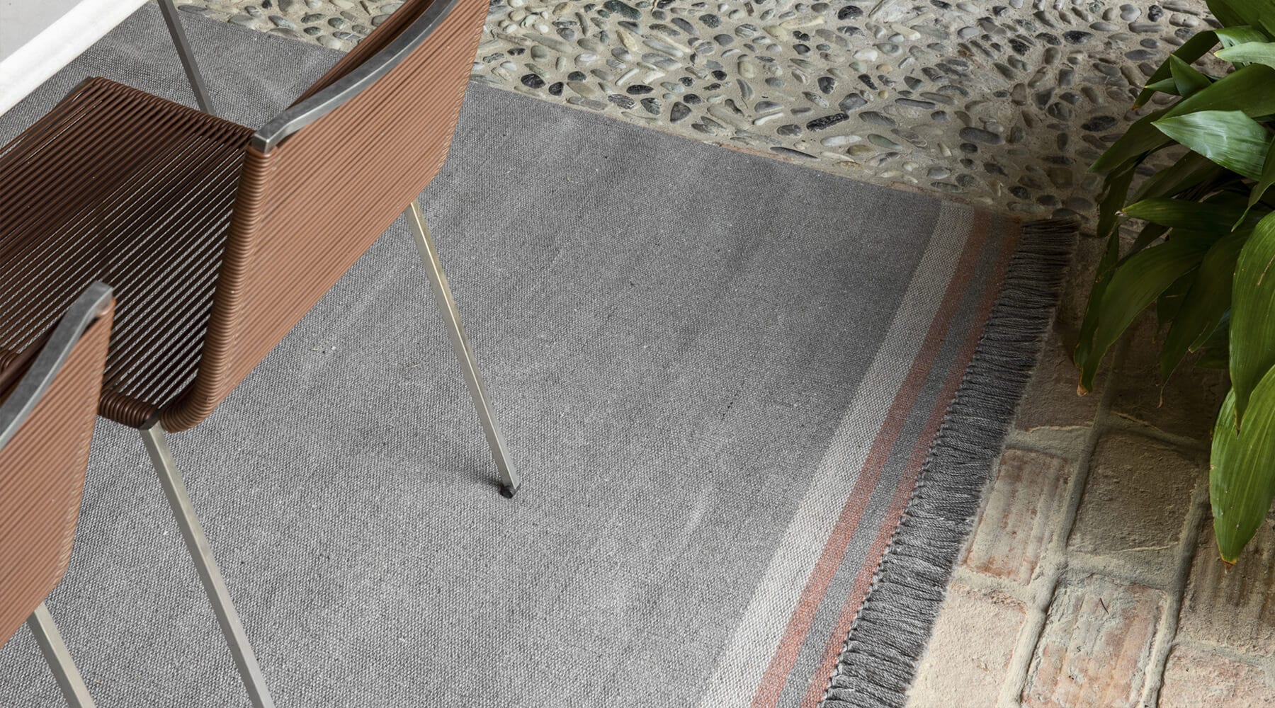 With the vintage appeal distinctive of some handcrafted cloth, Coco is characterised by the warm and reassuring tones of its flat weave and the decorative lines near the edges. An element with a functional character but also with a well-defined aesthetic, which becomes the characterising decor for the outdoors.